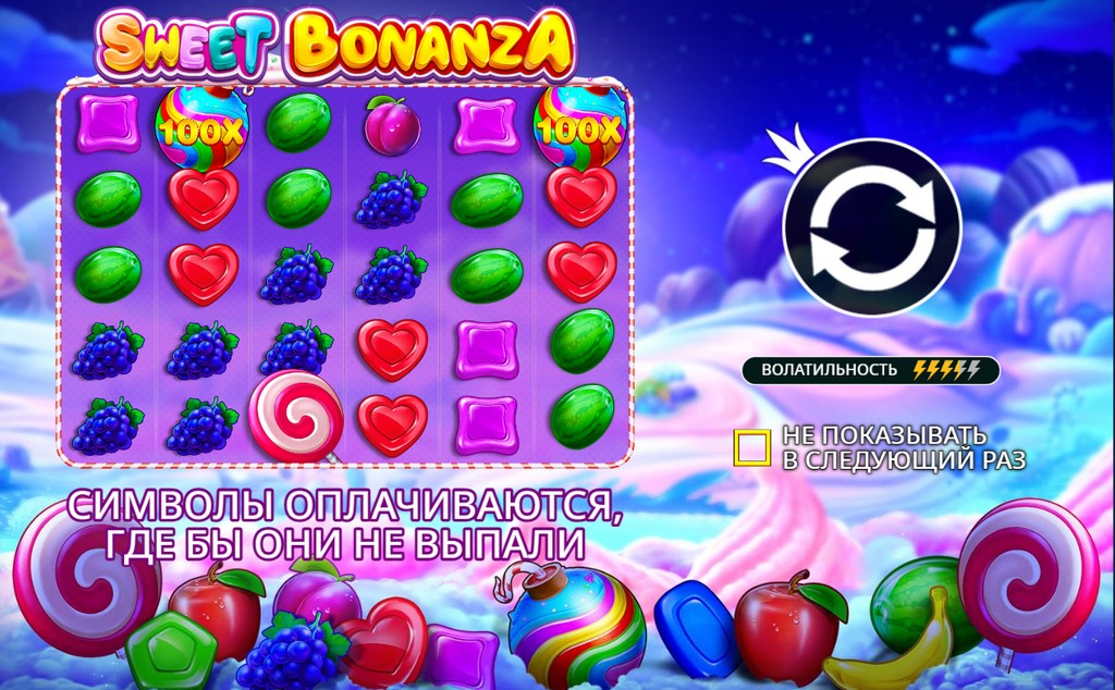 Pragmatic Play выпустили Sweet Bonanza летом 2019 года, и автомат сразу стал хитом. Секрет популярности прост — вместо скучных линий здесь работает кластерная система, где достаточно собрать 8 одинаковых картинок где угодно на экране, чтобы получить выплату. Максимум можно сорвать х21 100 от ставки, а в бонусах множители доходят до х100. Попробовать слот реально бесплатно в демке или сразу на рубли.
