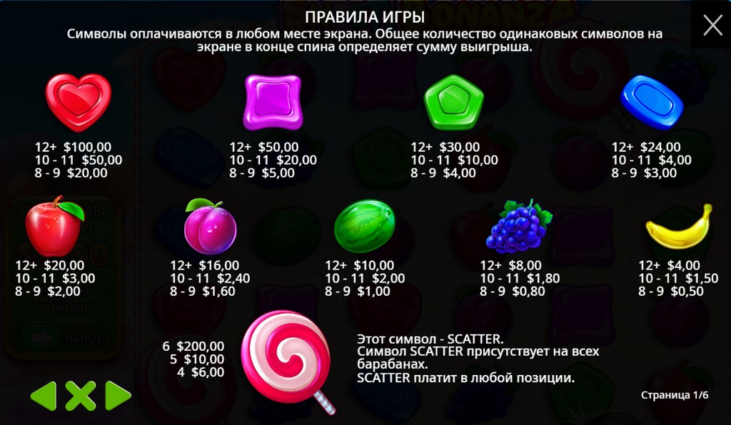 Леденец-скаттер — это отдельная история. 4 штуки дают х3, пять — х5, шесть — вообще х100 сразу. Но главное что они открывают бонусную игру с фриспинами.